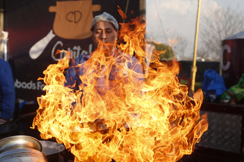 在巴基斯坦伊斯兰堡举行的美食节上,一名厨师用大火烹饪食物。