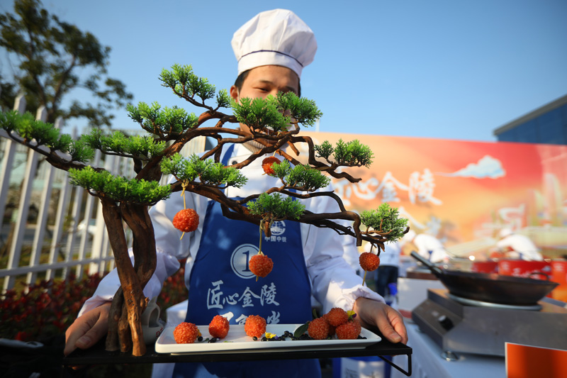 江苏南京,在中铁建工集团南京仙林项目部举办的以“匠心金陵,不负食光”为主题的厨艺大赛中,来自多个建筑工地的厨师同台煎、炒、炖、炸、蒸,通过拿手菜和规定菜两个环节的比拼,展示他们精湛的厨艺。图为参赛厨师展示菜肴。(图片来源:中新社)