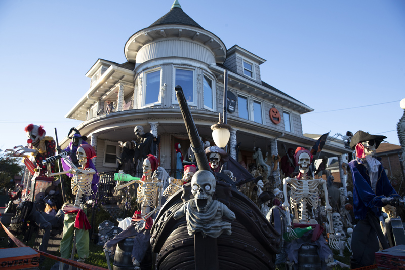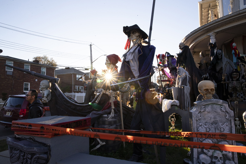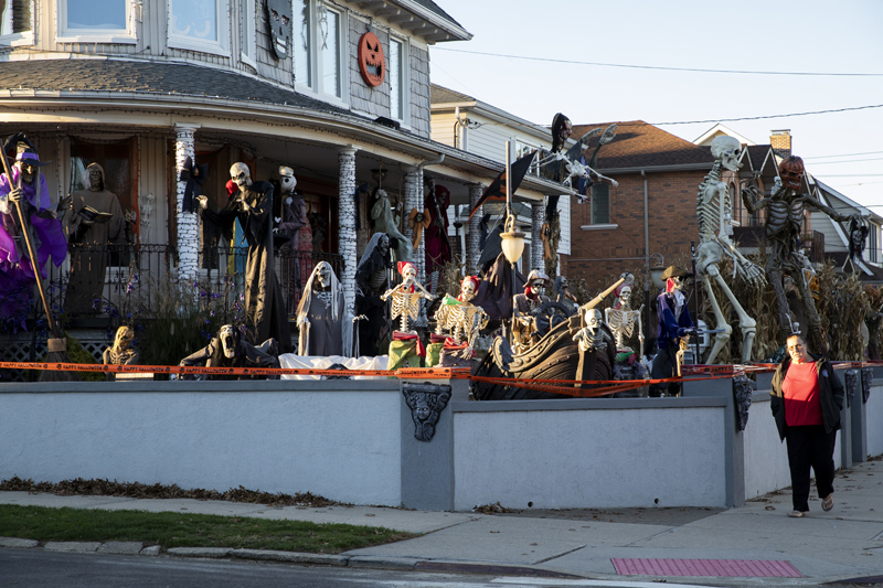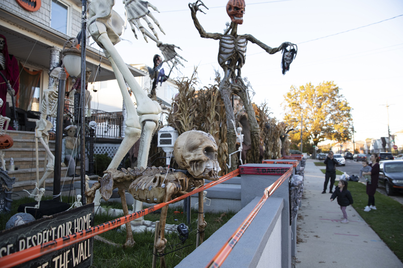 10月27日,美国纽约市皇后区一处居民住宅布置繁复的万圣节装饰,吸引许多路人驻足观赏。