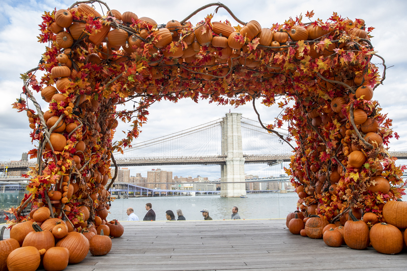 美国纽约曼哈顿17号码头,人们走过万圣节南瓜桥装饰,后侧是布鲁克林大桥。