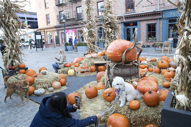 10月19日,美国纽约曼哈顿一条步行街布置南瓜装饰,吸引路人驻足。随著民众陆续布置装饰品,纽约万圣节气氛渐浓。(图片来源:香港中通社)