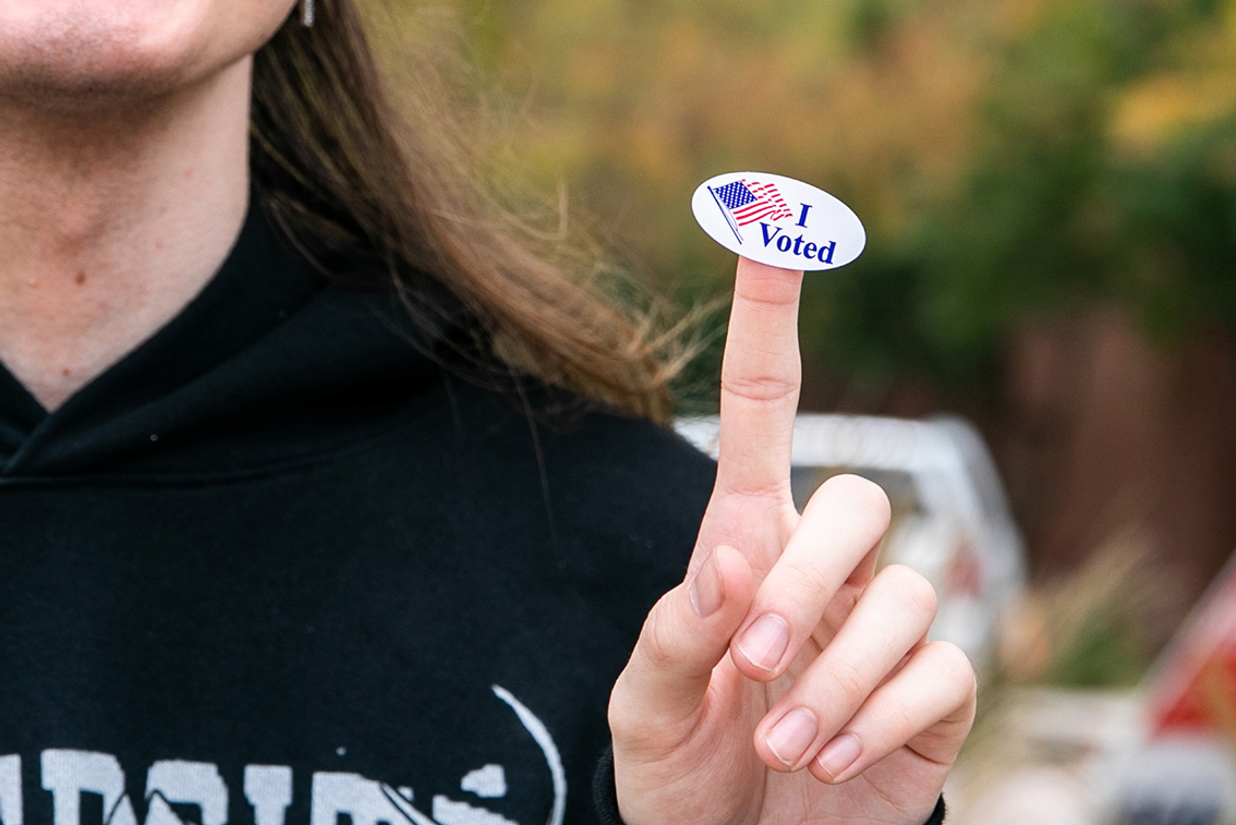 11月8日,在美国得克萨斯州普莱诺市,一名投完票的选民展示他的投票贴纸。