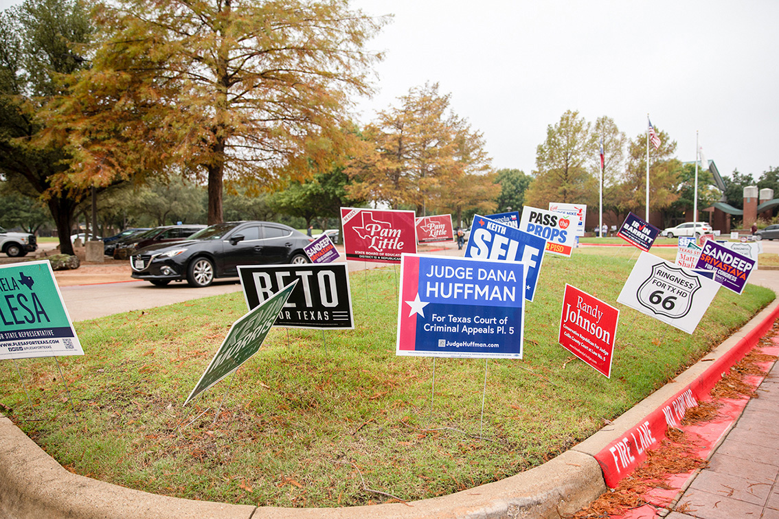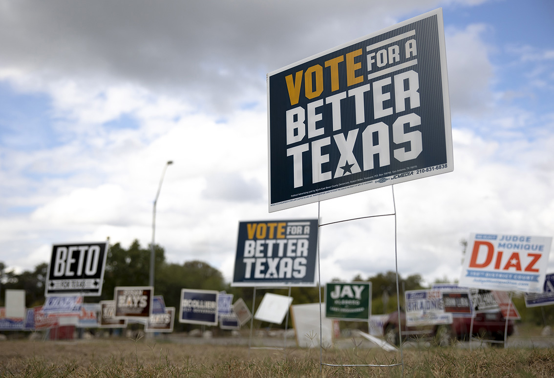 这是11月8日在美国得克萨斯州圣安东尼奥市一个投票站附近拍摄的竞选标语。
