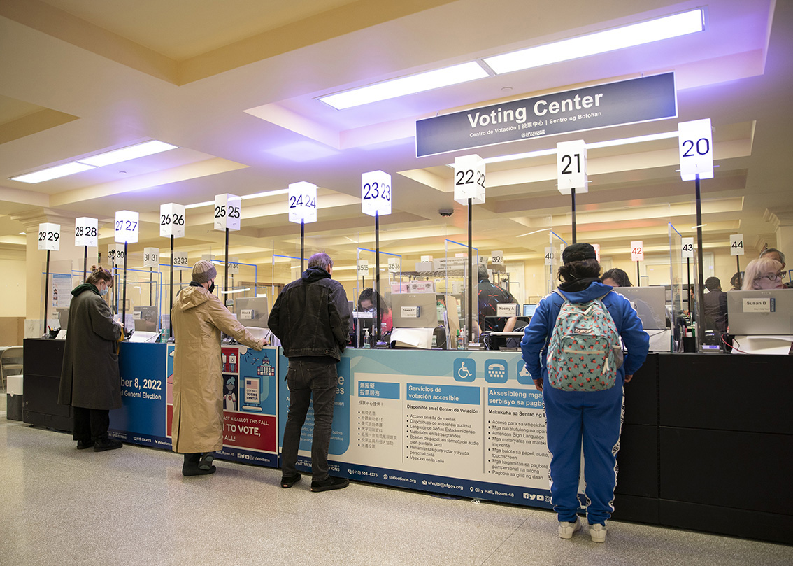 当地时间11月8日,美国加州旧金山选民在市政厅投票中心参加中期选举投票。(图片来源:中新社)