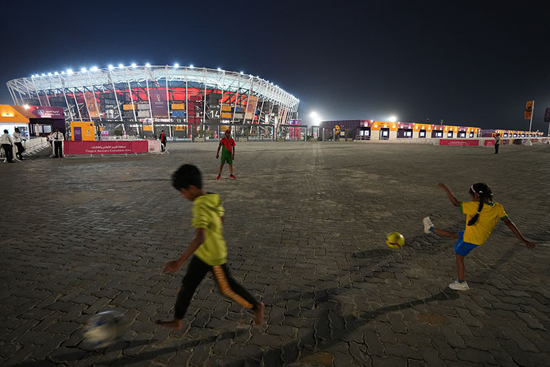 11月17日,卡塔尔多哈,来自印度的Jayaraj带着自己的儿子与女儿在974体育场外的广场上踢足球。