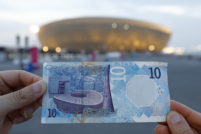 11月17日,卡塔尔货币里亚尔上,印有2022卡塔尔世界杯卢塞尔体育场外景。
