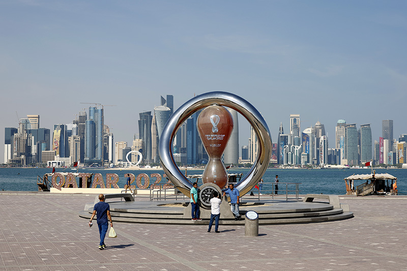 11月17日,卡塔尔多哈街头世界杯氛围浓厚。球迷在卡塔尔世界杯倒计时广场参观游览。