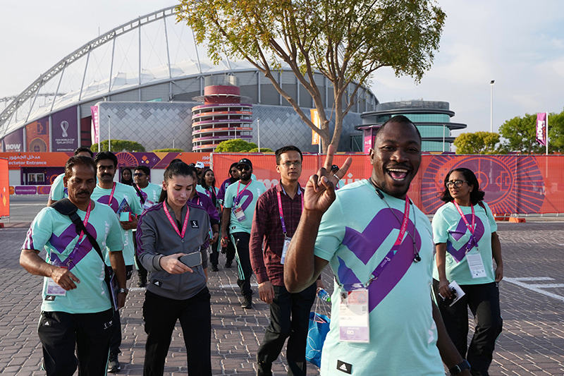 11月17日,卡塔尔多哈,哈里发国际体育场外的世界杯志愿者们。