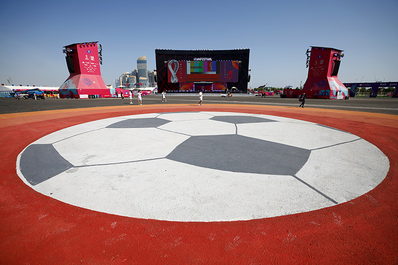 11月17日,卡塔尔世界杯球迷节广场上的巨型“足球”。球迷节广场将于19日正式营业。