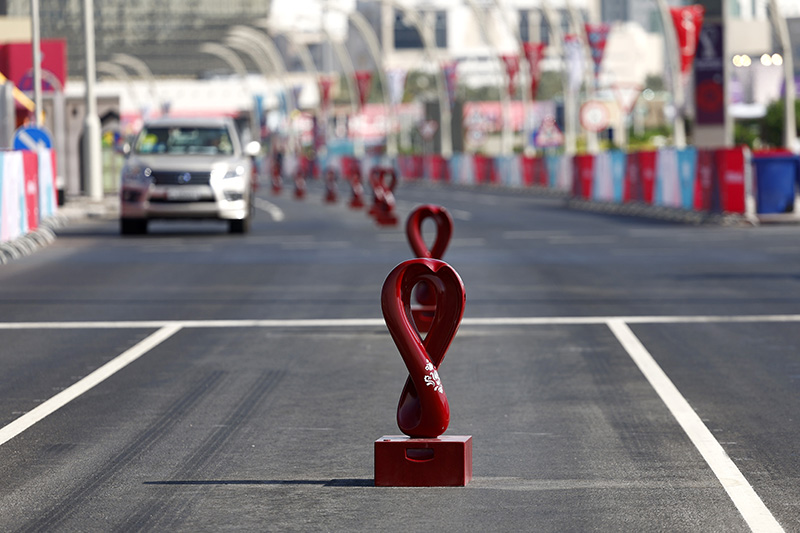 11月17日,卡塔尔多哈街头世界杯氛围浓厚。图为街头以世界杯标志为原型的交通隔离墩。