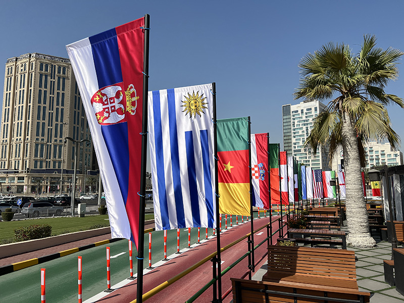 11月17日,卡塔尔多哈街头世界杯氛围浓厚。图为卡塔尔多哈,一餐厅旁设置的世界杯参赛国国旗招展。(图片来源:香港中通社)