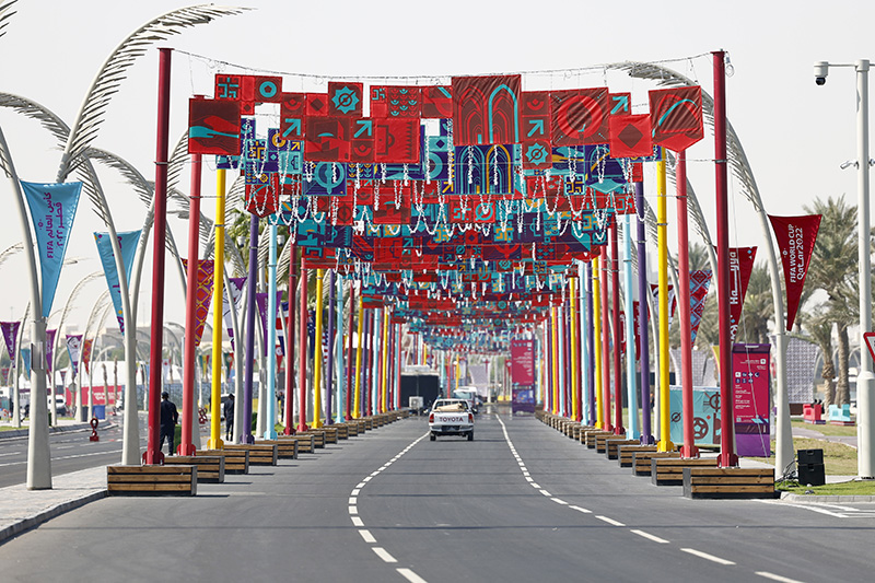 11月17日,卡塔尔多哈街头世界杯氛围浓厚。图为街头世界杯装饰。(图片来源:香港中通社)