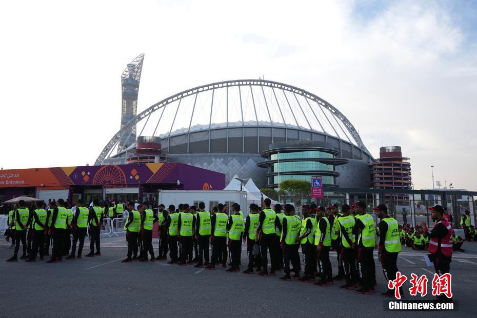 11月17日,卡塔尔多哈,工作人员集结,准备进入哈里发国际体育场。(图片来源:中新网)