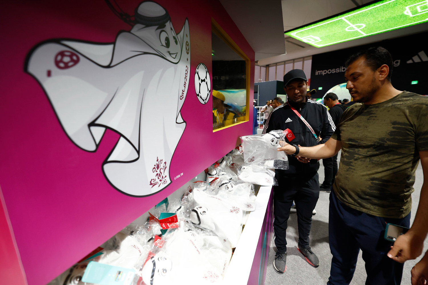 【欧洲时报网】20日,2022年卡塔尔世界杯开幕式在海湾球场举行,可爱的卡塔尔世界杯吉祥物等纪念品受到球迷热捧。