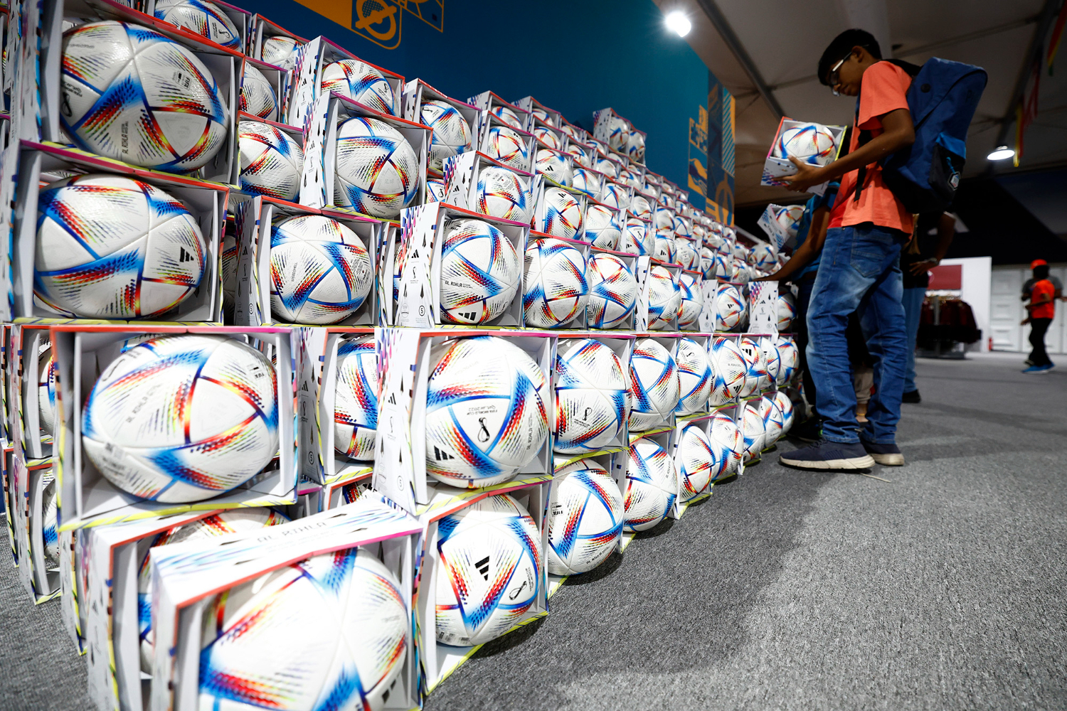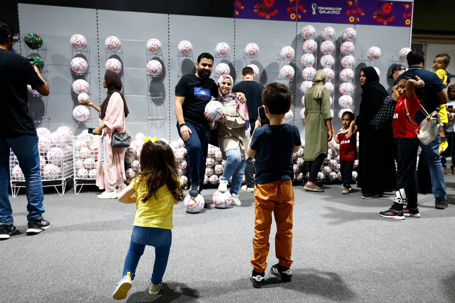 球迷在2022卡塔尔世界杯纪念品商店选购本届世界杯官方用球“旅程”。