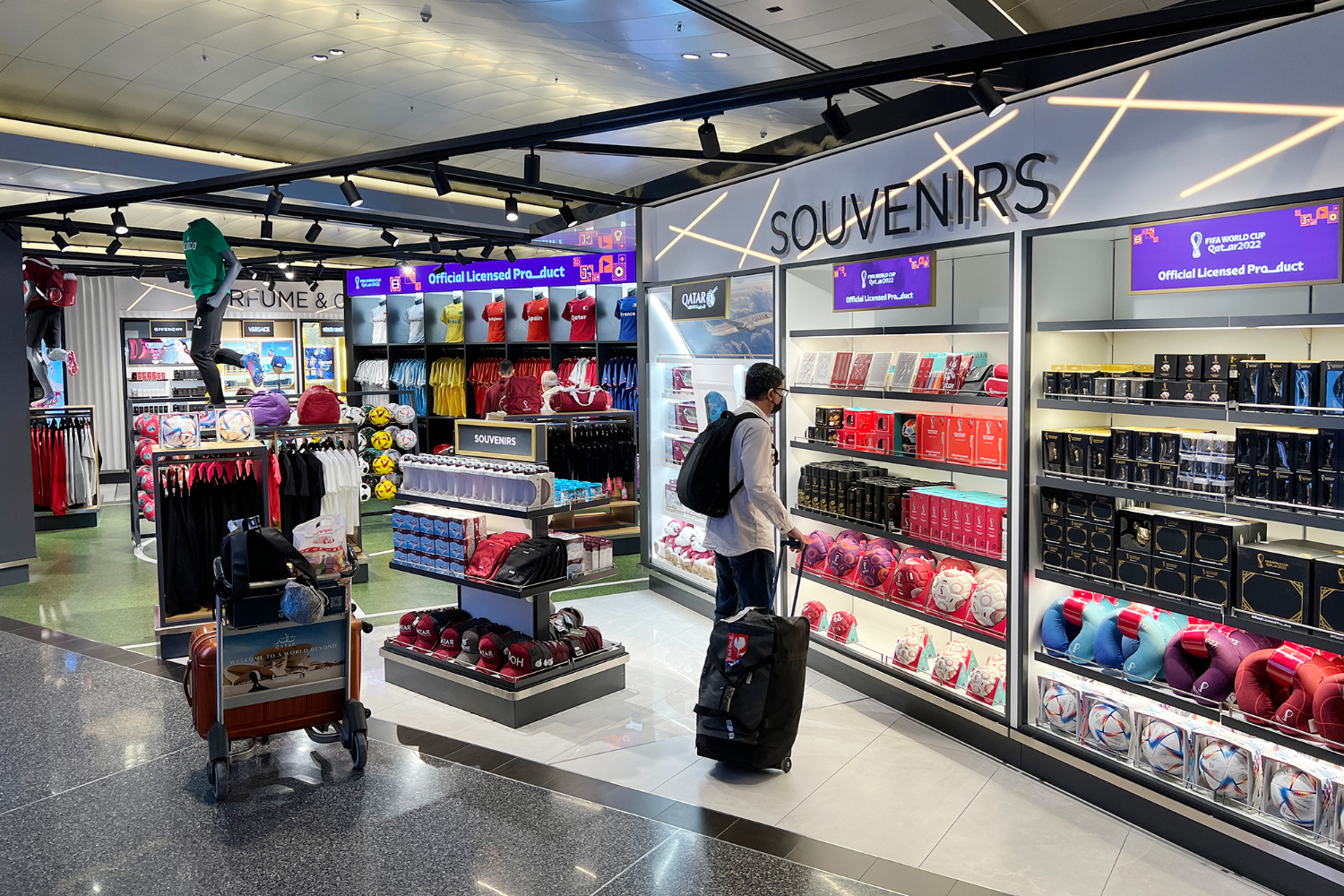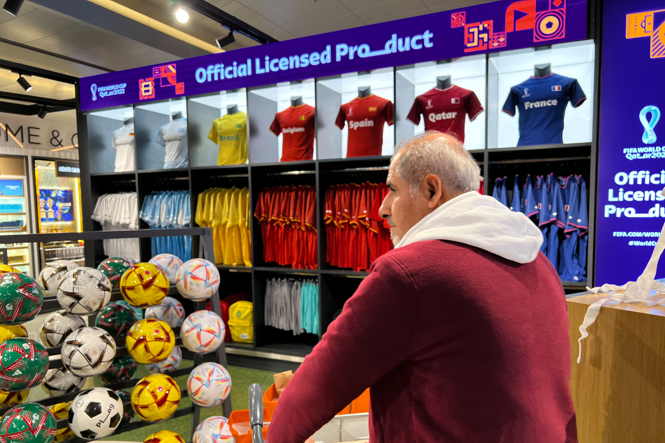 旅客在哈马德国际机场内的2022年世界杯纪念品商店中挑选纪念品。