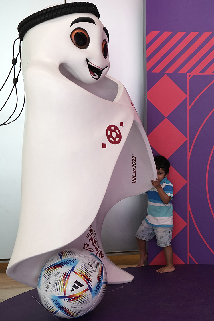 17日,卡塔尔多哈,一名男童在Hayya服务中心的世界杯吉祥物旁玩耍。