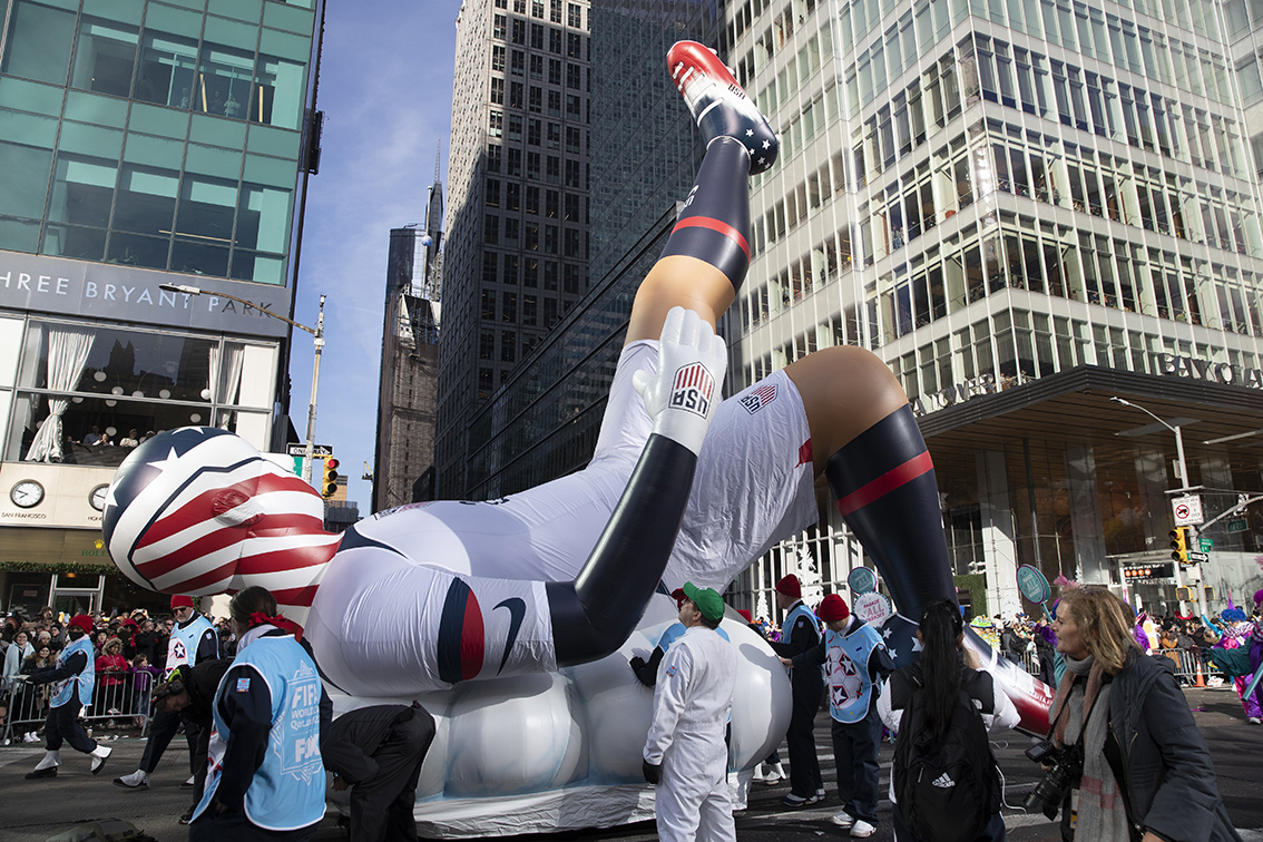 图为游行中的“美国男足”造型气球行进中。(图片来源:中新社)