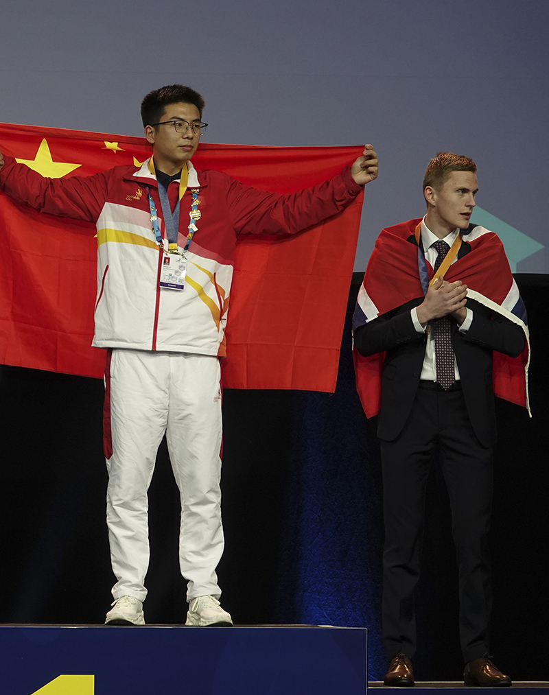 11月27日,在奥地利萨尔茨堡举行的2022年世界技能大赛特别赛奥地利赛区闭幕式上,获得工业控制项目金牌的中国选手姜昊(右)在颁奖仪式上。