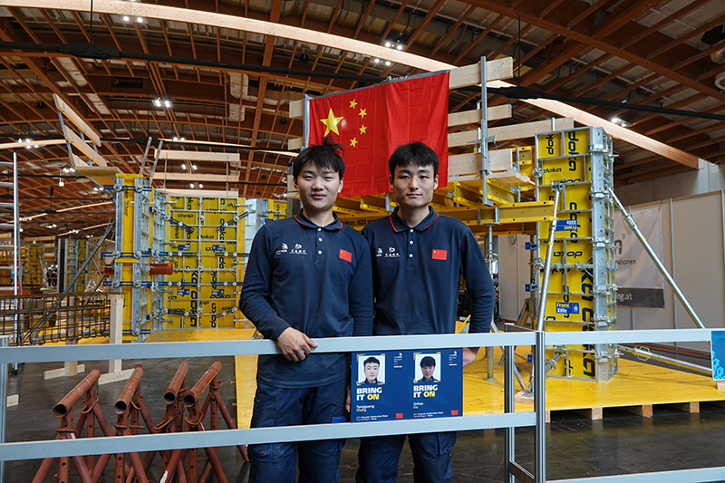 11月26日,在奥地利萨尔茨堡,来自郑州商业技师学院的张阳光(右)和刘锦豪在完成混凝土建筑项目比赛后与作品合影。二人合力摘得该项目铜牌。