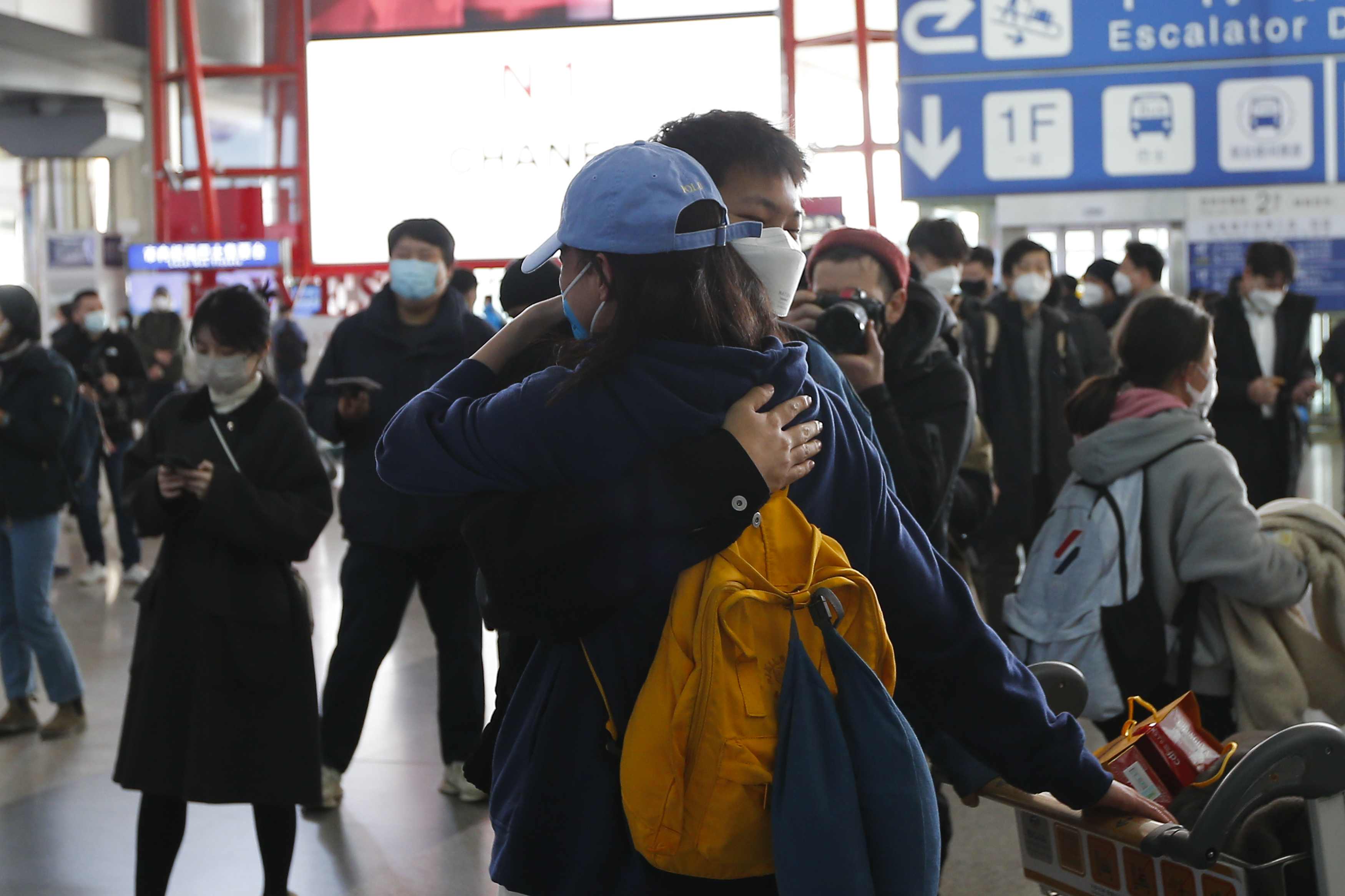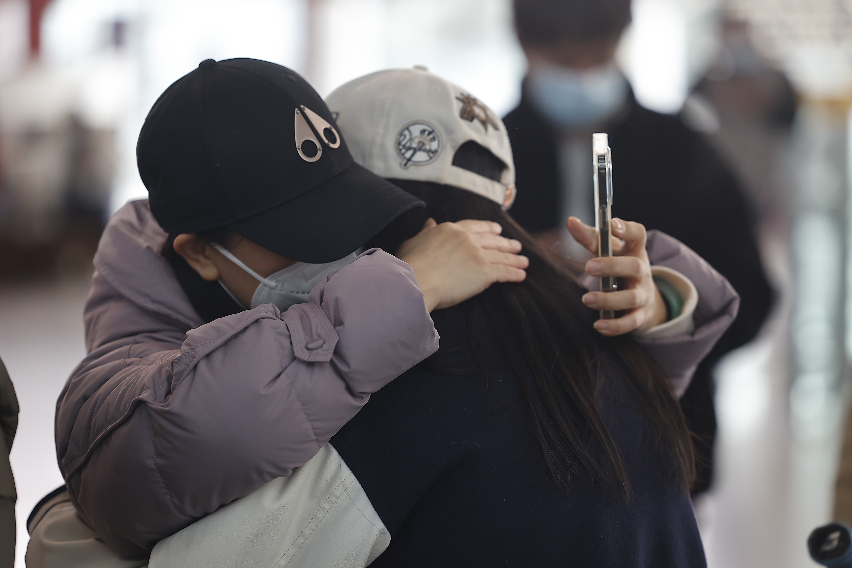 2023年1月8日,一名旅客到达北京后与亲朋相拥。