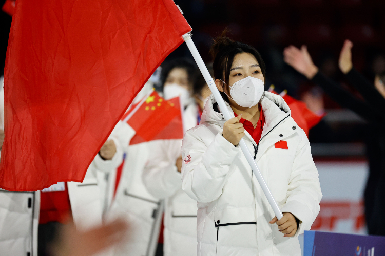 1月12日,中国大学生体育代表团旗手韩雨在入场仪式上。(图片来源:新华社)