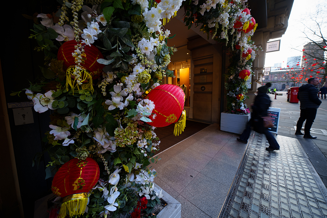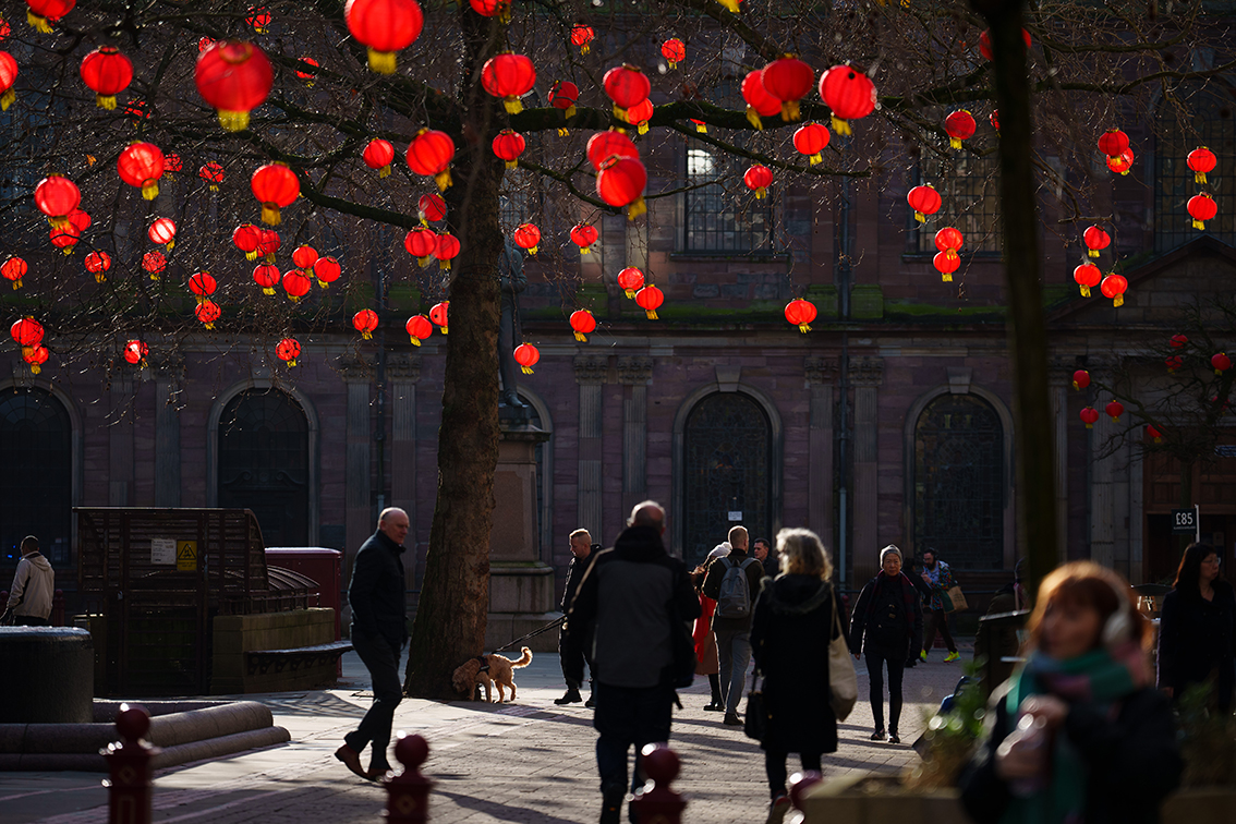 1月18日,英国曼彻斯特市中心悬挂红灯笼,迎接农历春节的到来。