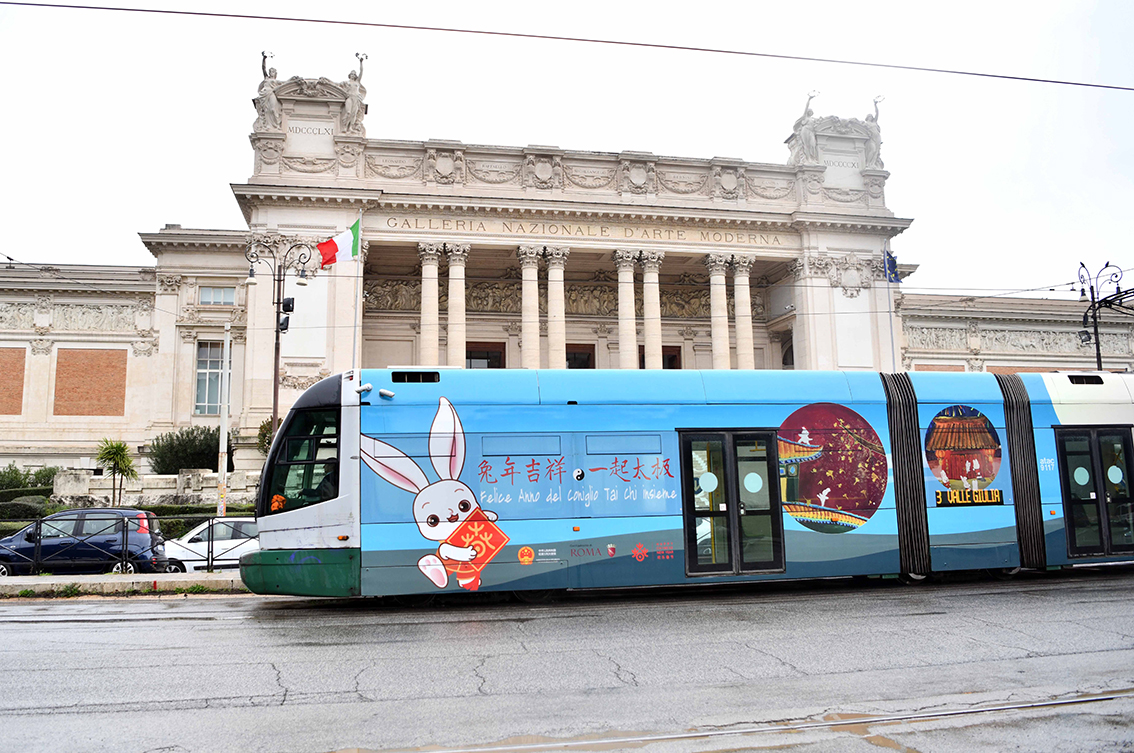 1月17日,兔年主题电车行驶在意大利罗马街头,庆祝即将到来的中国农历新年。