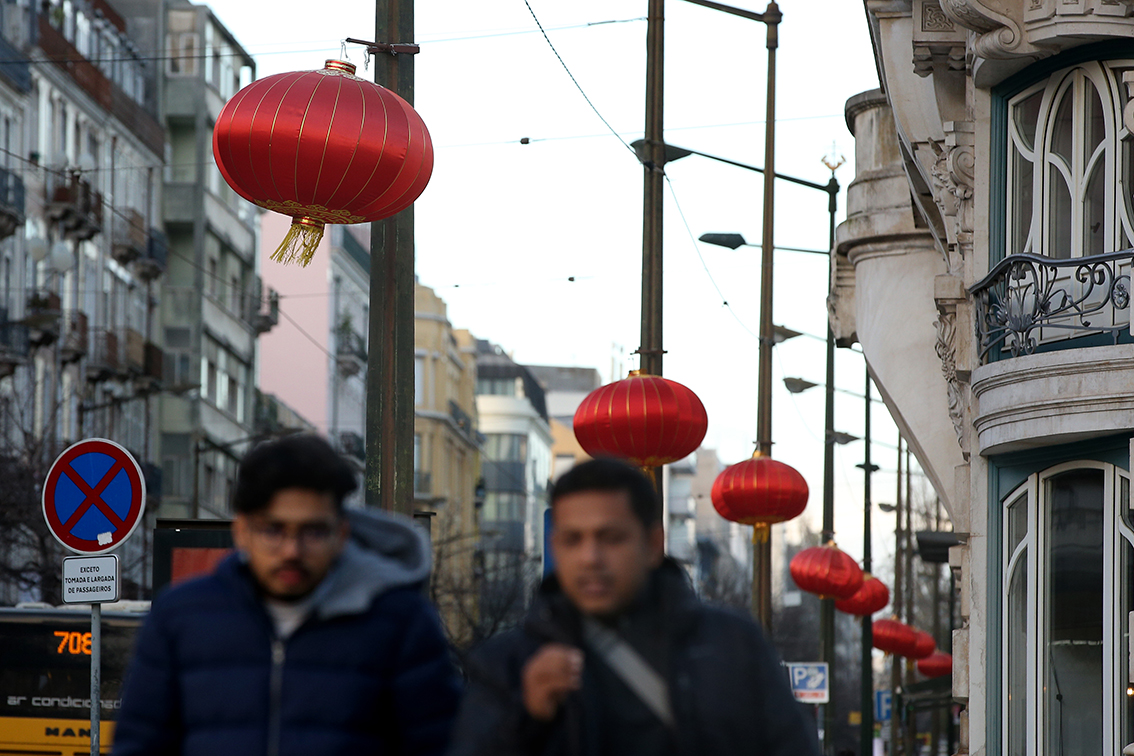 1月17日,人们经过葡萄牙里斯本街头庆祝农历春节的红灯笼装饰。