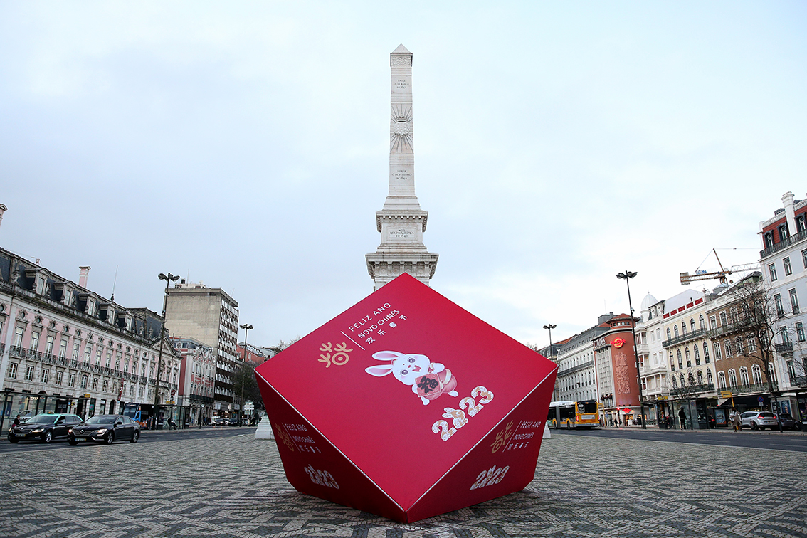 这是1月17日在葡萄牙里斯本街头拍摄的庆祝农历春节的装置。