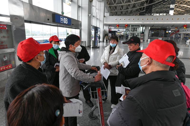 2月8日,在北京首都国际机场2号航站楼,中青旅遨游网领队为前往泰国旅游的游客讲解出行安排。
