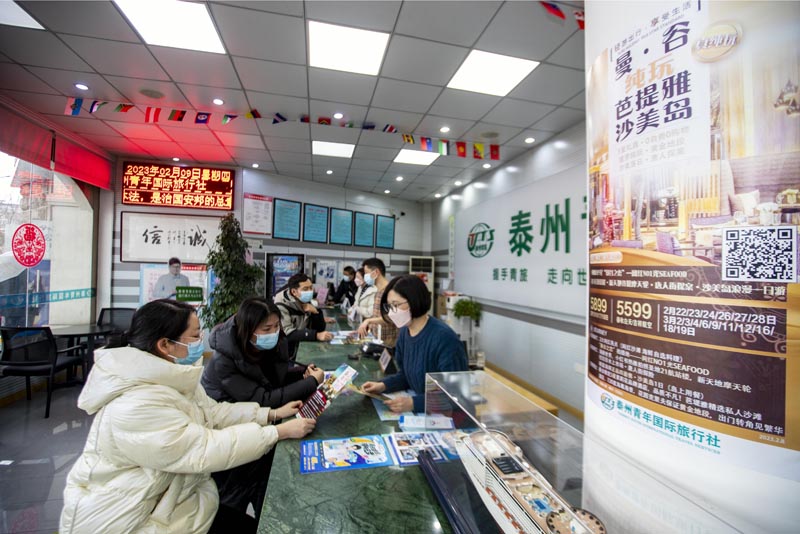 2月9日,市民在江苏省泰州市青年国际旅行社销售网点咨询。