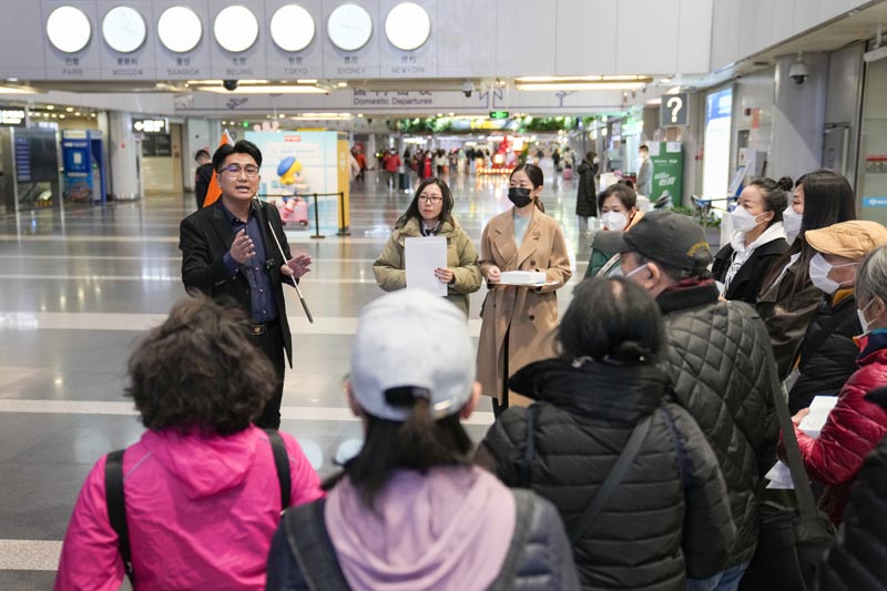 2月10日,在成都双流国际机场T1航站楼,旅行社领队向赴泰旅行团讲解注意事项。