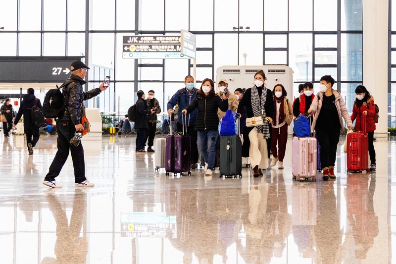 2月8日,前往印尼巴厘岛的旅行团旅客在杭州萧山国际机场T4航站楼候机。