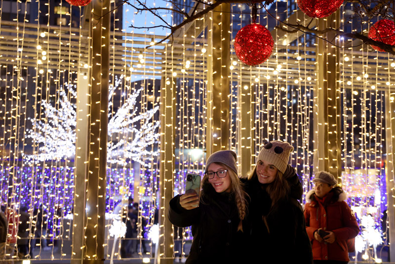 2月18日,加拿大多伦多,在布洛-约克维尔街区举行的冰雕节上,游人在冰雕与灯饰前自拍留影。(图片来源:中新社)