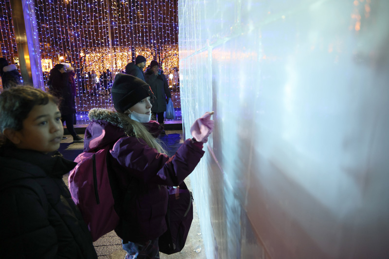 2月18日,加拿大多伦多,在布洛-约克维尔街区举行的冰雕节上,小观众好奇地触摸冰砖墙。(图片来源:香港中通社)