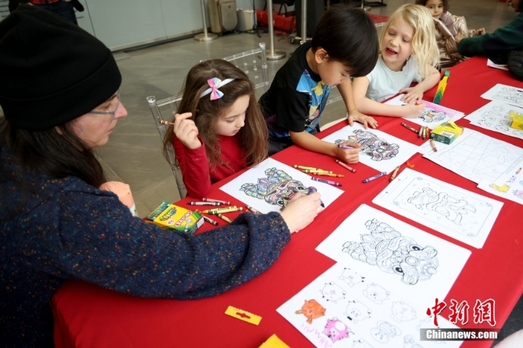 孩童们为中国醒狮等图画填色。(图片来源:中新网)