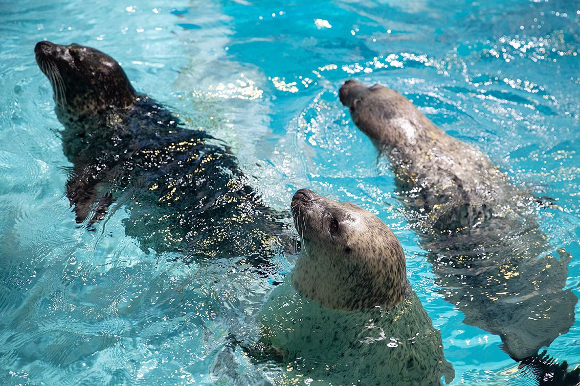 2022年12月31日,哈尔滨极地公园的海豹在水池中休息。(图片来源:新华社)