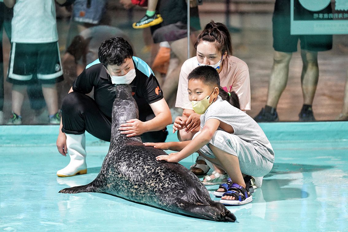 2022年7月22日,哈尔滨极地公园,孩童与海豹互动。(图片来源:中新社)