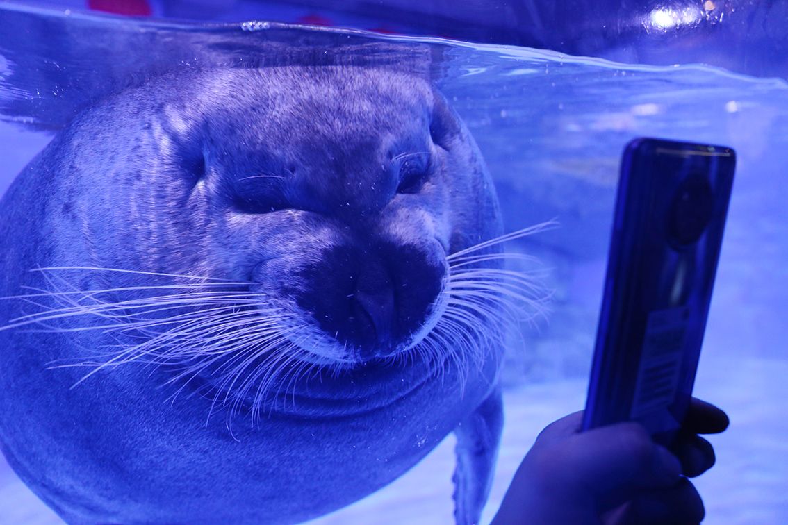 2022年2月4日,上海,海昌海洋公园推出“极地动物运动会”庆冬奥,冰山北极馆内海豹观看游客手机里自己的“比赛重播”。(图片来源:中新社)