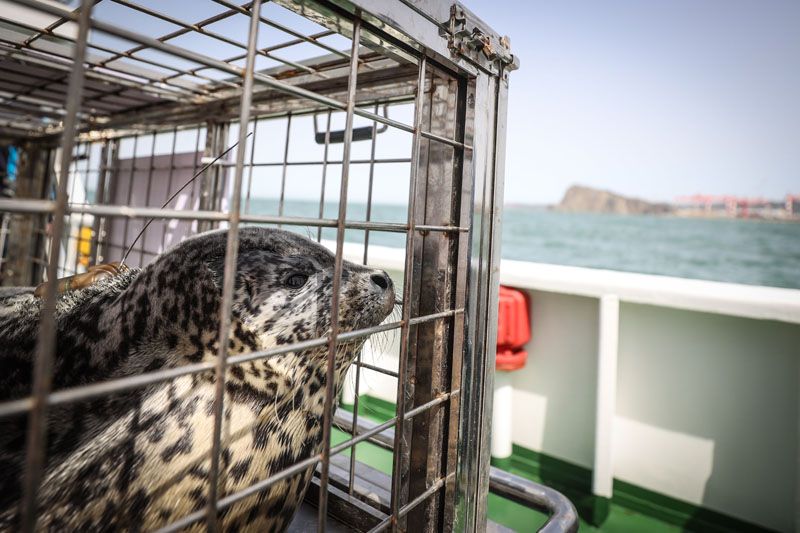 2021年4月16日,由辽宁海洋水产科学研究院与大连圣亚海洋世界共同保护和繁育的8只斑海豹放归大海,(图片来源:央广网)