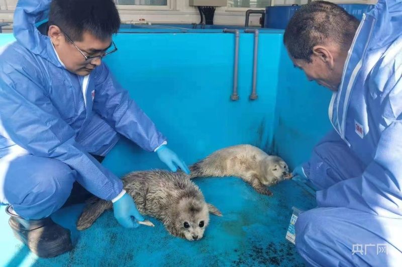2022年6月8日,大连斑海豹国家级自然保护区,两只被救助的斑海豹在治疗痊愈后放归大海。图为斑海豹保护区管理局与辽宁省海洋水产科学研究院工作人员观察受救助斑海豹。(图片来源:央广网)