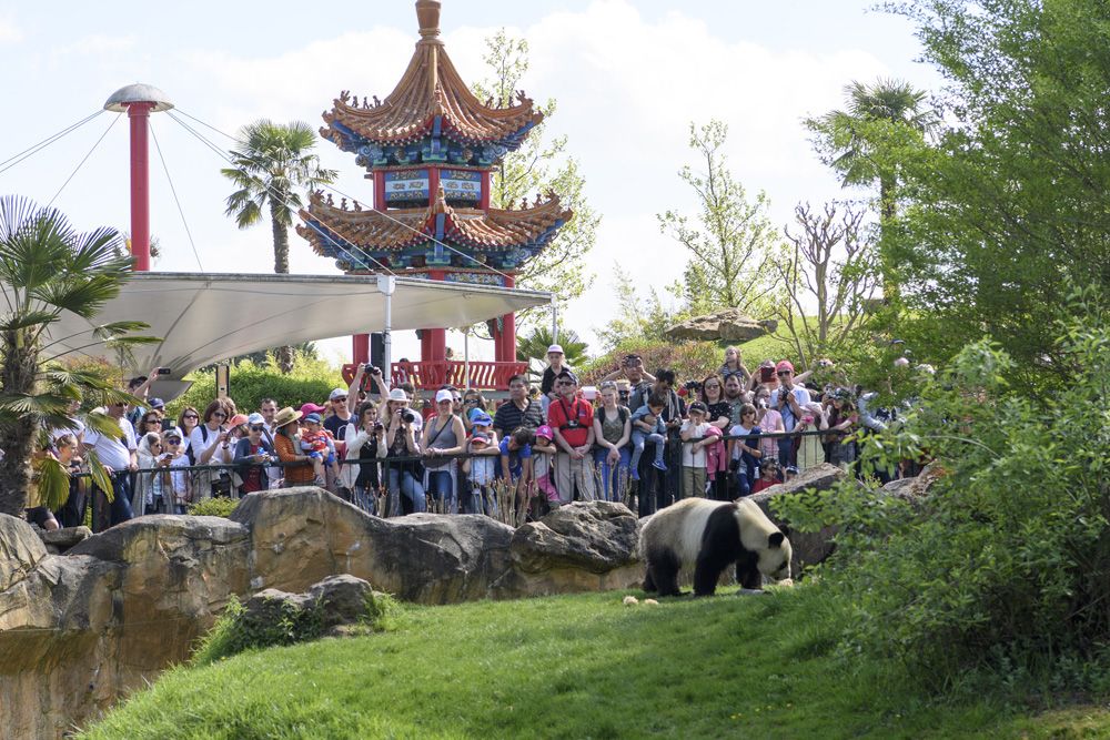 2018年4月24日,游客在法国圣艾尼昂市博瓦勒动物园观看大熊猫“圆仔”。(图片来源:新华社)