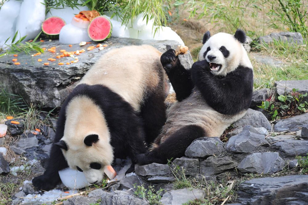 在比利时布吕热莱特的天堂动物园,大熊猫“宝弟”(左)、“宝妹”享用“生日大餐”。(图片来源:新华社)