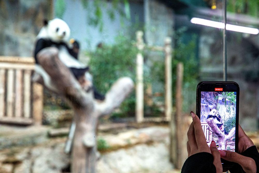 在马来西亚吉隆坡,饲养员给大熊猫“升谊”喂食。(图片来源:新华社)