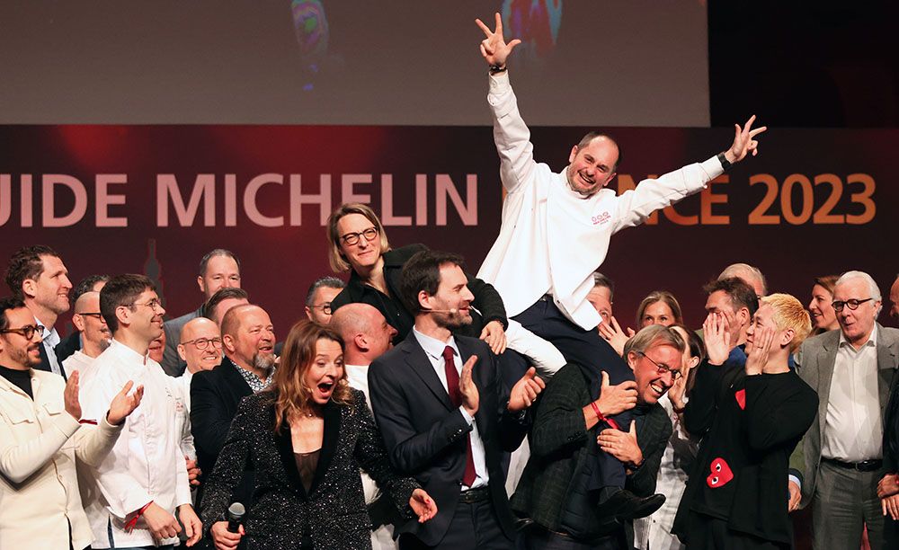 法国厨师亚历山大·库永在法国东部城市斯特拉斯堡举办的2023《米其林指南》法国版发布仪式上庆祝。(图片来源:新华社)