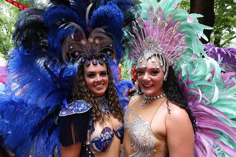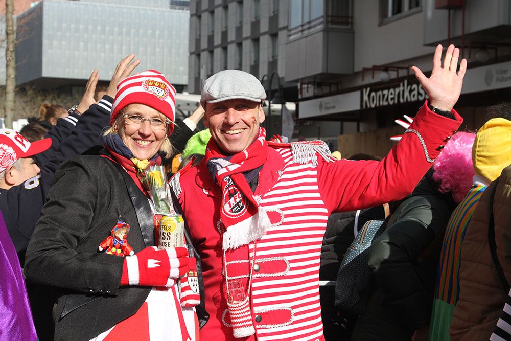 在德国科隆,参加“玫瑰星期一”大游行的两名狂欢者合影。(图片来源:新华社)