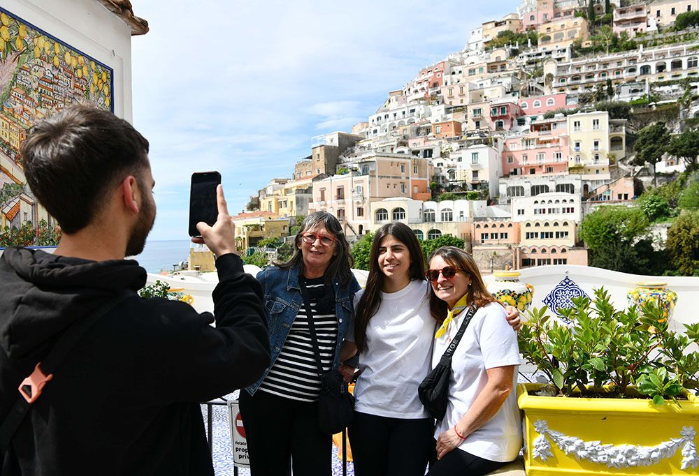 游客在意大利阿马尔菲海岸小镇波西塔诺拍照。(图片来源:新华社)