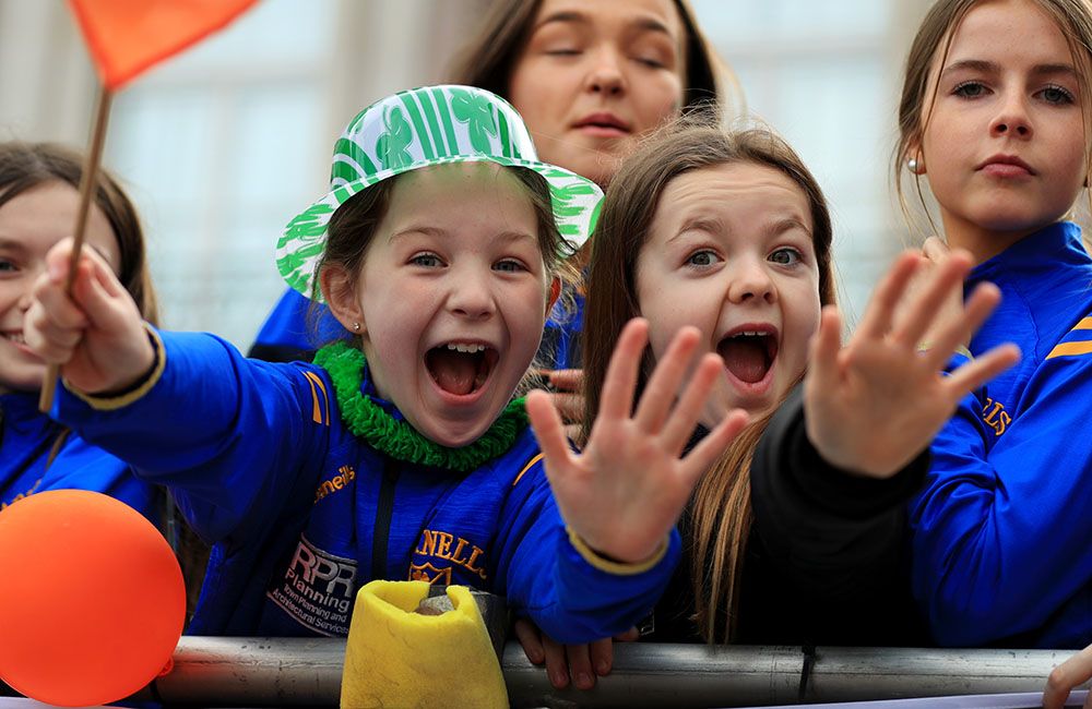 在英国伦敦,孩子们参加圣帕特里克节游行。(图片来源:新华社)