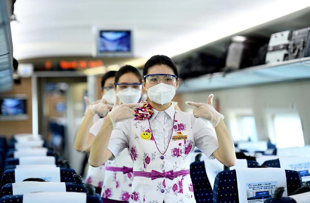 在成都东开往北京西的G308次列车上,成都客运段乘务人员展示自己编排的微笑操。(图片来源:中新社)
